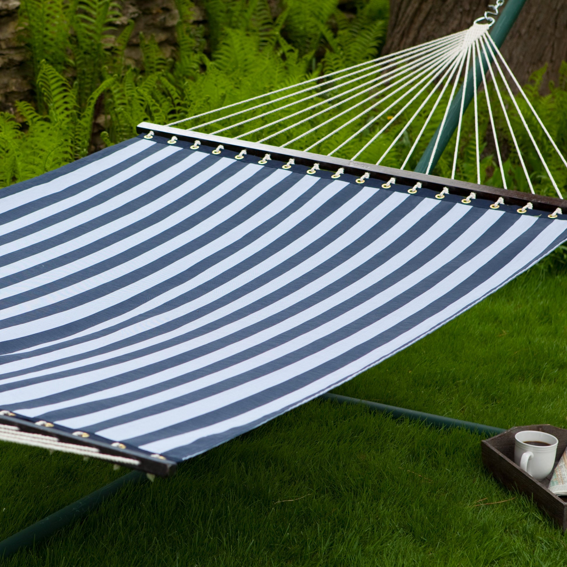 Alberca Quick Dry Hammock - Stainless Rings and S Hooks - Blue & White Stripes. These hammocks are perfect for beachfront, poolside, riverside or dockside, as they are very quick to dry after a rainfall or use by a swimmer eager for a rest.