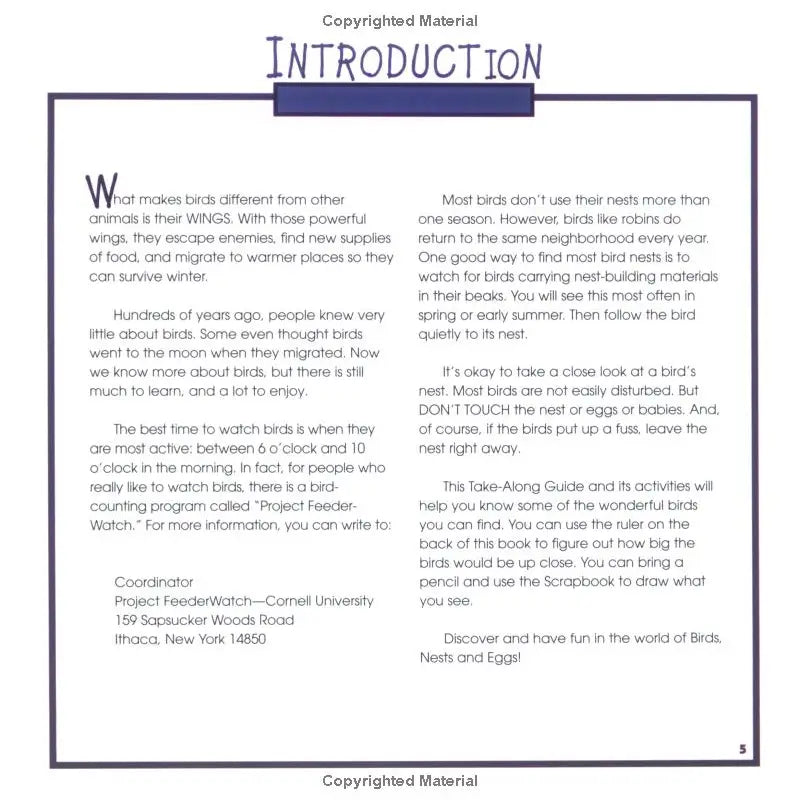 A fun, informative take-along guide that will help children identify 15 birds. Kid will also learn how and where birds build their homes and all about their young. Plus, the guide features activities that are fun and easy to do. There's also a seven-page scrapbook for drawings and notes. Invites young naturalists to spot wildlife. Safety tips are provided, and interesting activities are suggested. Color illustrations enhance the presentation. —-HORN BOOKS (Tracks, Scats and Signs)