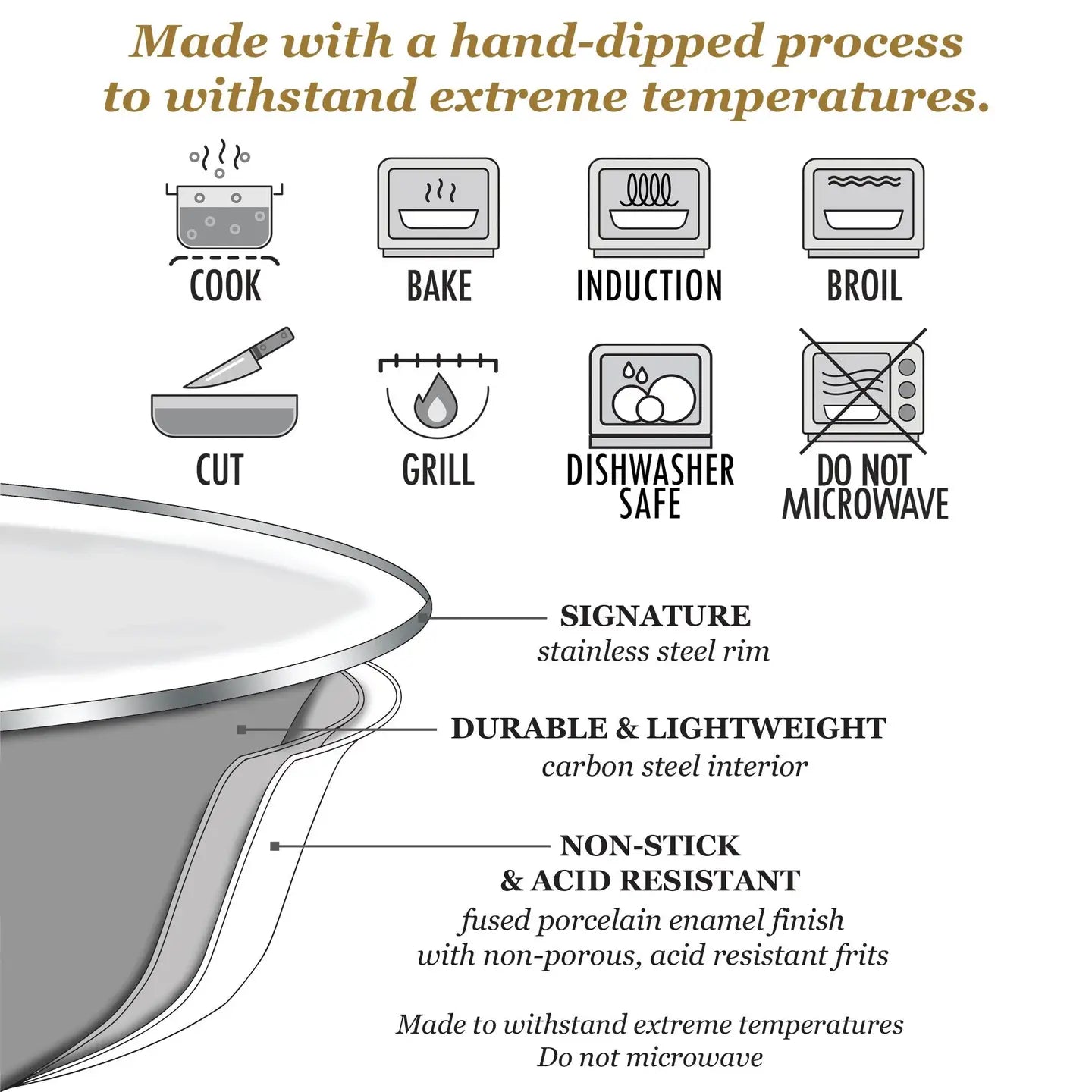 These enamelware pieces add the perfect dash of style and sophistication to your meals. You’ll be sure to excite appetites and eyes with our selection of enamelware pails, stock pots, platters and more. As always, these pieces are built to maintain their artistic appeal and function for many years to come.