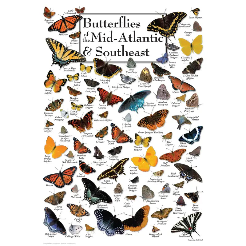 Pieces: 550 Size: 18" x 24" Artist: Rick Cech P/N: 30518 Beautiful artistic representation of 79 species of butterflies – both common and exotic – – found in the the following states: New York, New Jersey, Pennsylvania, Ohio, Indiana, Kentucky, Tennessee, Virginia, West Virginia, Delaware, Maryland, South Carolina, North Carolina, Georgia, Alabama, and Mississippi.