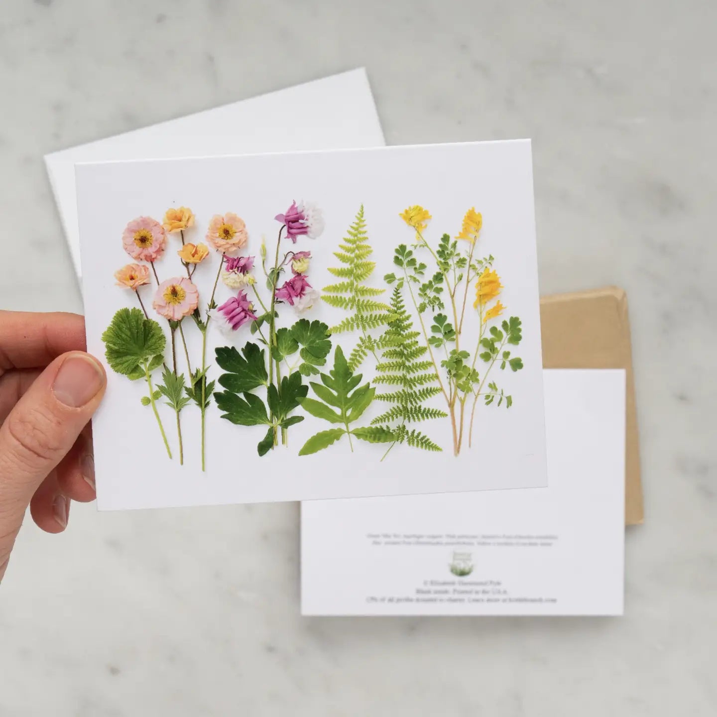Wildfowers of spring, including peach geum, pink columbine, ferns and yellow corydalis on a card. Created using homegrown plants and contemporary photography techniques. Printed on an appealingly soft and hefty card stock. Rear caption lists plants depicted on front. • Forest Stewardship Council certified.
