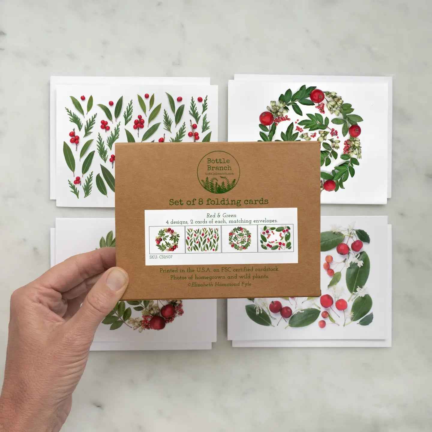 Set of eight cards featuring vibrant photography images of bright red crabapples and berries with evergreen leaves. Set contains two cards each of four different, related card designs, for a total of eight cards. Created from photographs of fresh plant material, these designs pop off the paper and bring your package to life.
