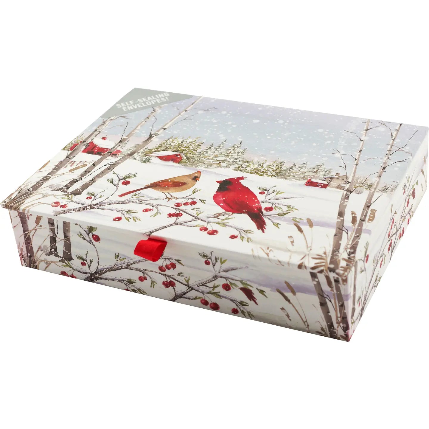 The white stationery envelopes included are self-sealing for your convenience -- simply peel and stick. Sturdy reusable box features a reproduction of the card design on the lid. A smaller image is replicated inside. Box comes with a ribbon tab, ribbon hinge, and magnetic closure. Perfect for storing notes, holiday mementos, postage stamps, and more!