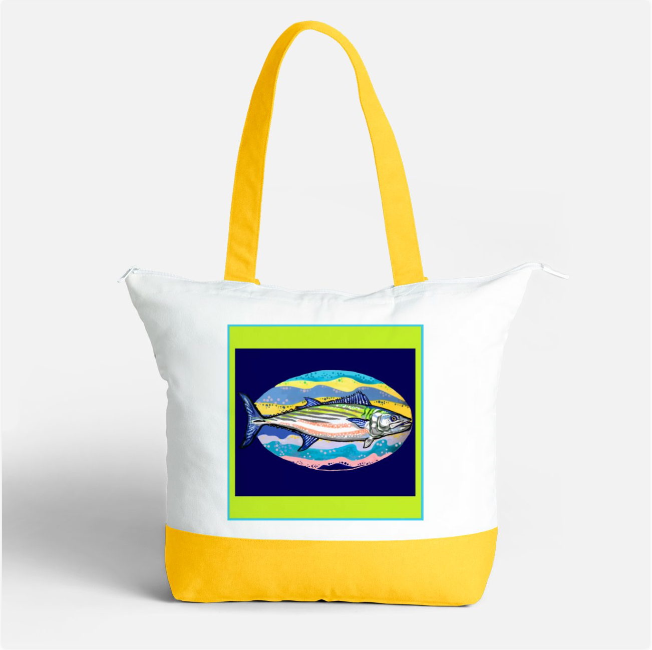 A colorful zipper tote bag with inside zipper pocket.