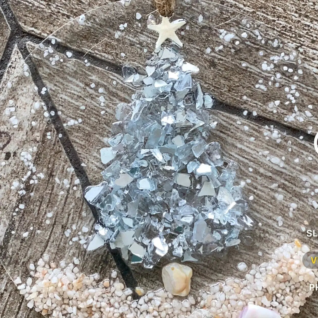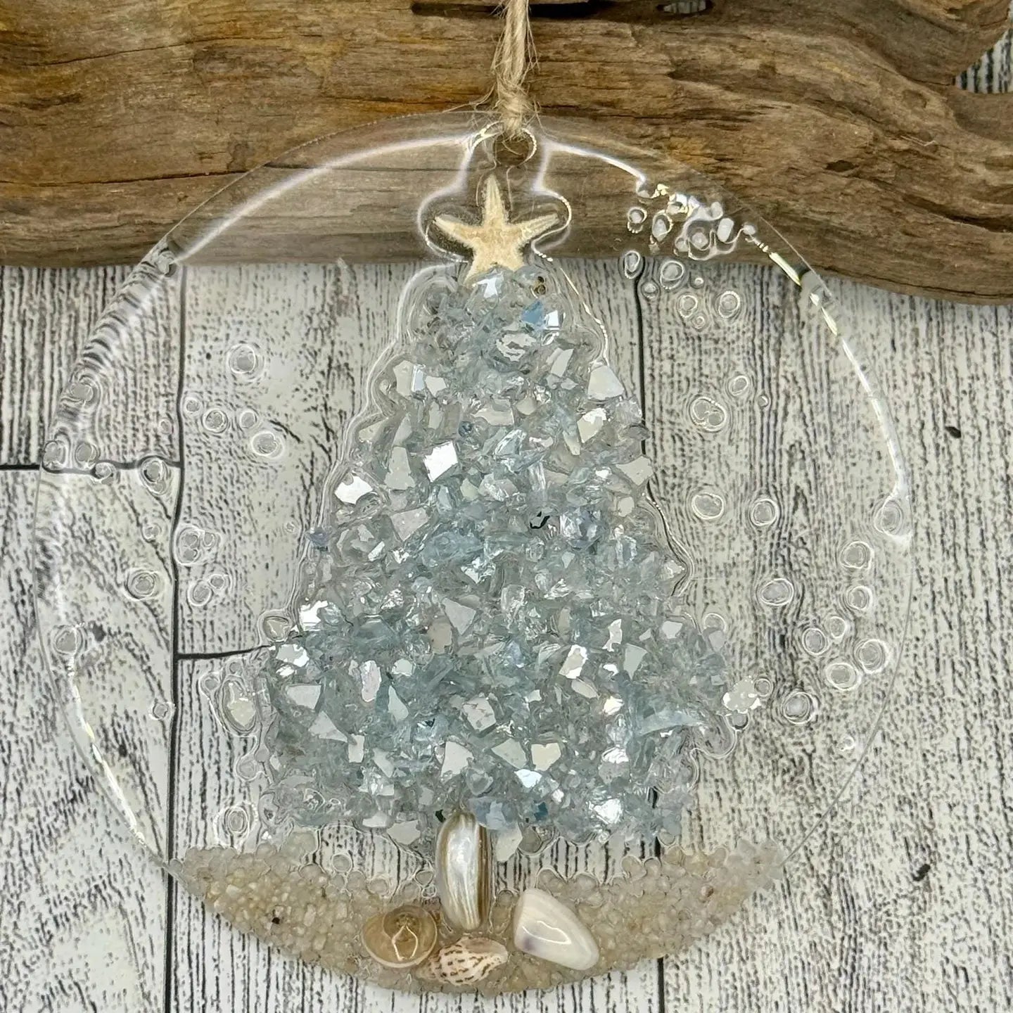 Dress up your Christmas Tree Coastal- style! The Silver crushed glass CHRISTMAS TREE features tiny seashells and a real starfish on a sandy BEACH and is set in resin on a clear acrylic 4" round ornament. Twine hanger makes it easy to place on your tree! Perfect as a sun catcher too!! Price is for one tree ornament. Order yours today ! Thank you for visiting Sea Dreams! Happy Holidays!