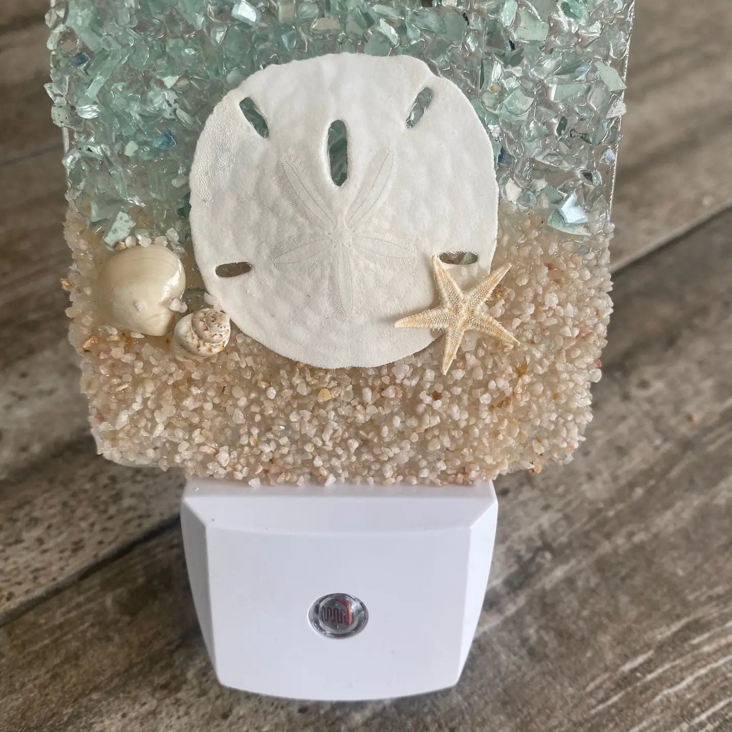 Coastal Night Light with PHOTOCELL features a majestic SAND DOLLAR, seashells and tiny STARFISH , scattered on a sandy beach with a crushed AQUA glass OCEAN! A great way to add a little COASTAL style to your home! Makes a GREAT and affordable HOSTESS gift too! Plug- in style with soft WHITE glowing light. Clear plastic structure. Size of lighted area is 3" x 3" .Overall size is 3" x 4.5". Other styles available and can also customize!! See photo for choices! Each Night Light is made to order and may vary slightly in style and shells etc. Thank you for visiting SEA DREAMS Coastal Art shop!