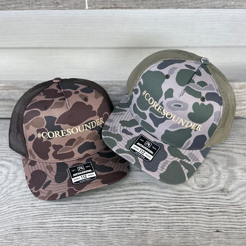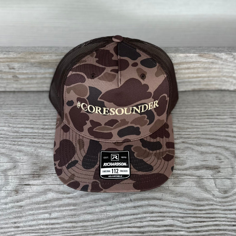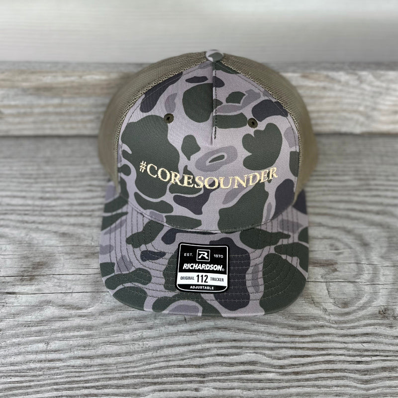 Richardson Original Trucker Camo Hat embroidered with #Coresounder in khaki