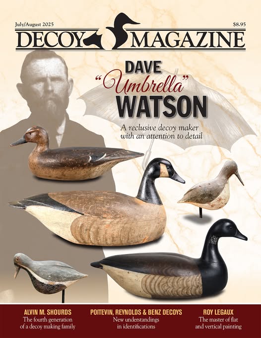 Our cover story is on Dave "Umbrella" Watson, a reclusive yet talented decoy maker from Willis Wharf, Virginia. For fans of factory decoys, there's an article that details the differentiations between Poitevin and Reynolds decoys. There are profiles on Alvin M. Shourds, a fourth-generation carver from a famous decoy making family, and Roy LeGaux, a talented Louisiana carver who mastered the art of flat and vertical painting. And there are all the latest decoy auction and show reports.