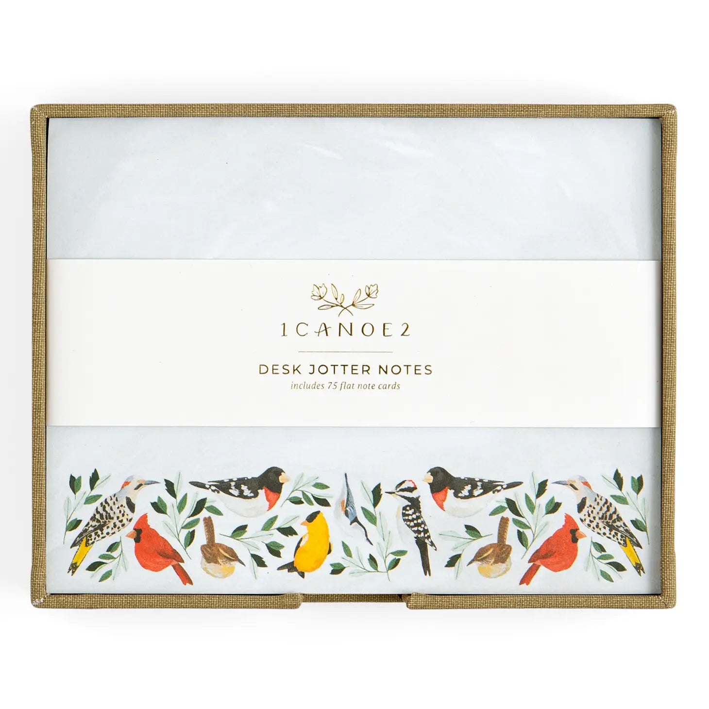 Bring a touch of nature to your desk with the Feathered Friends Birds Desk Jotter. Featuring charming, hand-painted bird illustrations, this organized notecard holder adds a whimsical flair to your workspace. A thoughtful gift for bird enthusiasts, nature lovers, artists, or anyone who appreciates a touch of creativity in their daily note-taking. Format | Desktop notecard organizer Features | Linen-wrapped box with notch cutout, 75 gold gilt-edged notecards Size | Box: 4.5" x 5.75" x 1.25"; Notecards: 4.25" x 5.5" Origin | Imported Product Type | Desk Jotter Title | Feathered Friends Birds Desk Jotter