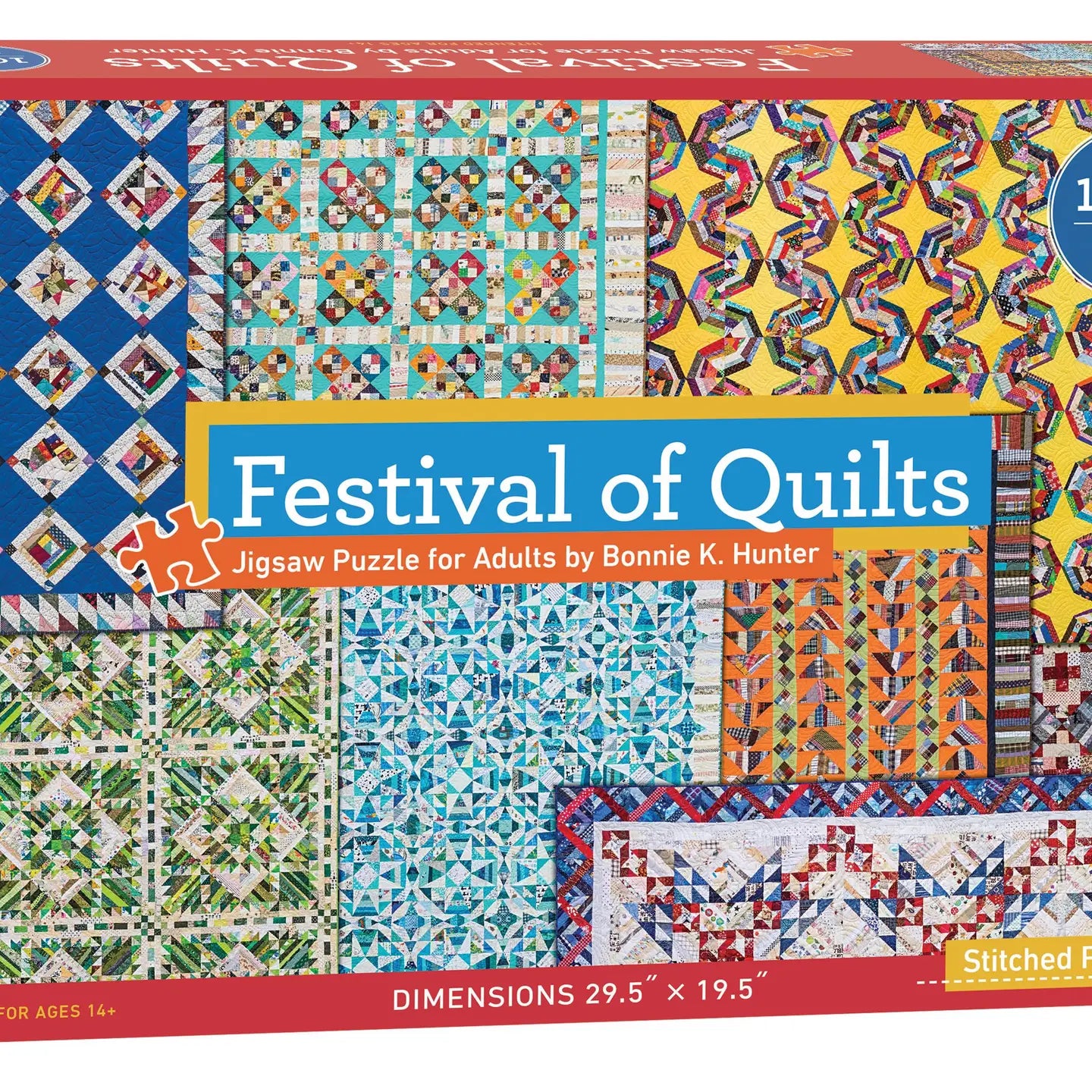 Festival of Quilts Jigsaw Puzzle by Bonnie K. Hunter: 1000 Pieces, Dimensions 29.5” x 19.5”. Pursue your quilting interest in new ways with this 1,000-piece jigsaw puzzle featuring Bonnie K. Hunter's gorgeous quilts. Like piecing together fabric scraps to make a quilt top, this pastime will give you a sense of satisfaction and fulfillment. Enjoy it yourself, or share your love of quilting with the puzzle aficionado in your life—this one makes a great gift for quilters, Bonnie Hunter fans, and anyone who loves a good challenge.