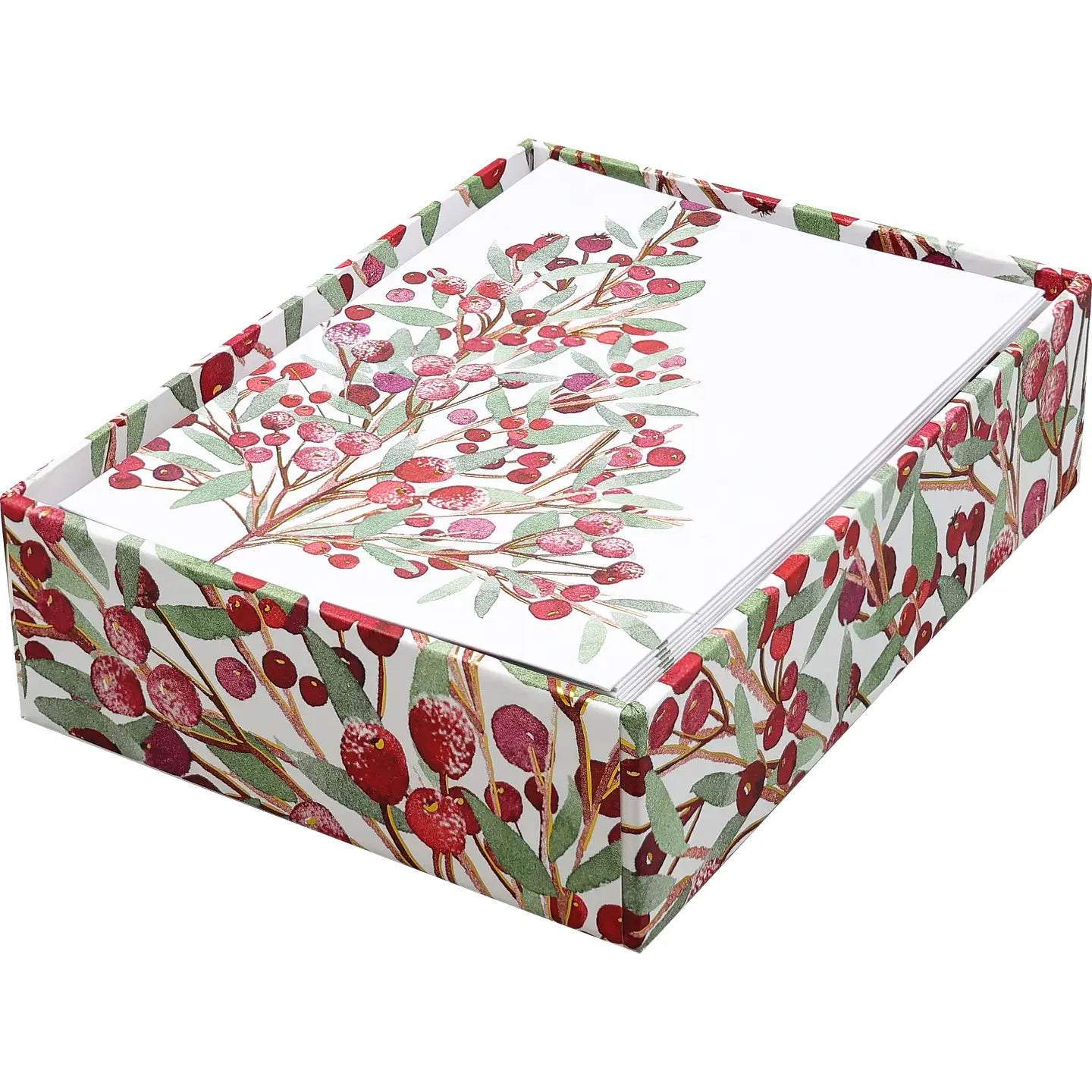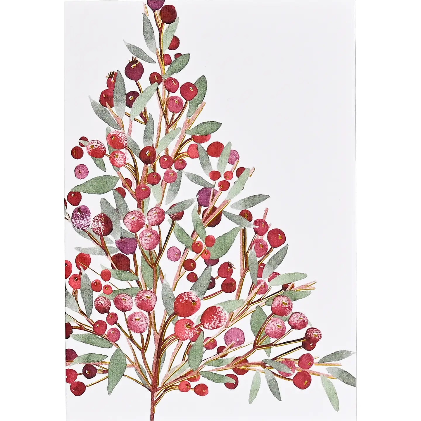 Artful greeting cards combine red berry-laden branches with sage green leaves to capture the essence of the holiday season.