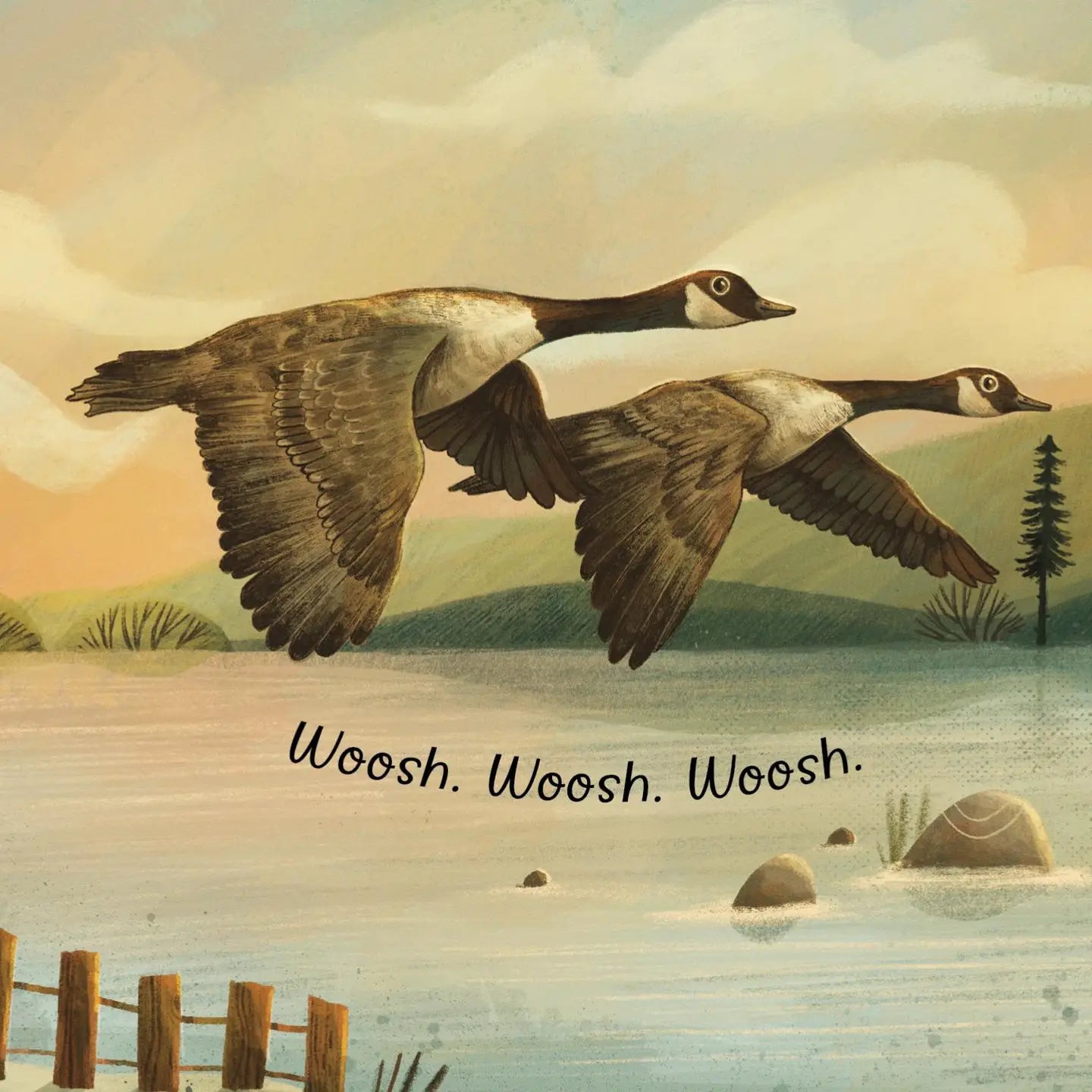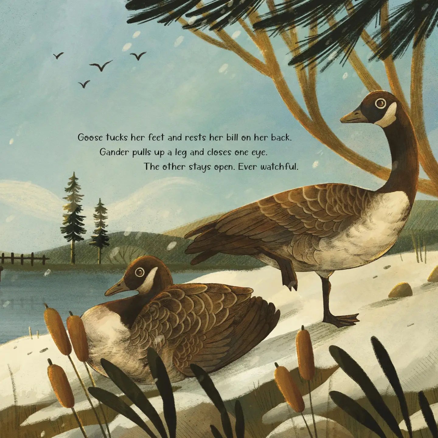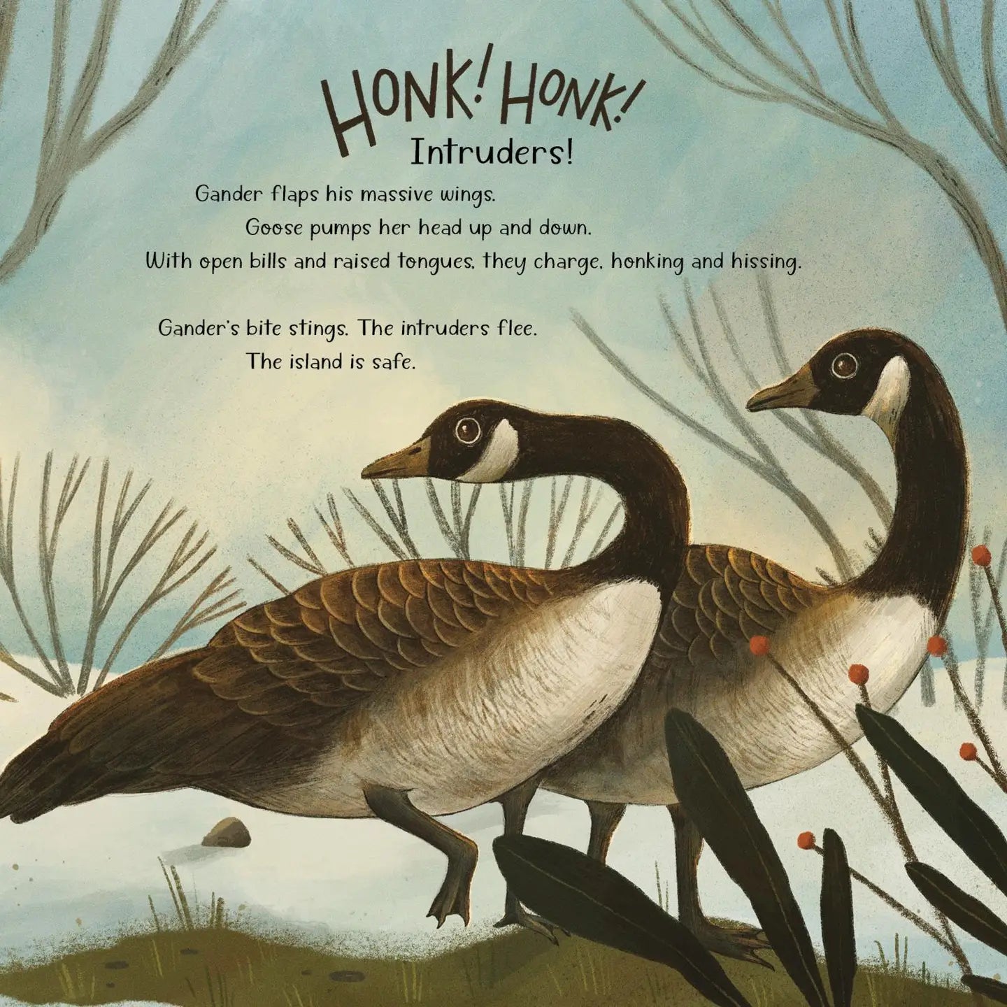 Did you know that geese mate for life? This lyrical, richly illustrated story gives readers a beautiful glimpse into the life cycle of Canada geese. On a chilly spring day, Goose and Gander flap down toward a little island just beginning to thaw out after a long winter. It is here that they will build a nest, lay eggs, and wait. And wait. And…wait. For the goslings to arrive. During all that waiting—through sun and snow, day and night—Goose keeps their eggs warm, while Gander protects the little island.