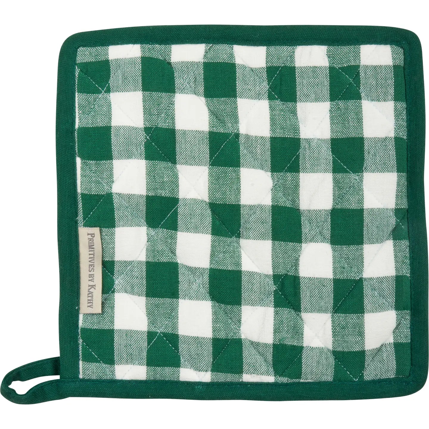 A kitchen set from our Farmhouse Collection including a potholder and matching oven mitt displaying vintage art of two ducks with coordinating punny sentiments. Potholder design features embroidered "I Don't Give A Duck" sentiment and oven mitt features "Don't Duck With The Chef" with dark green trim on both.