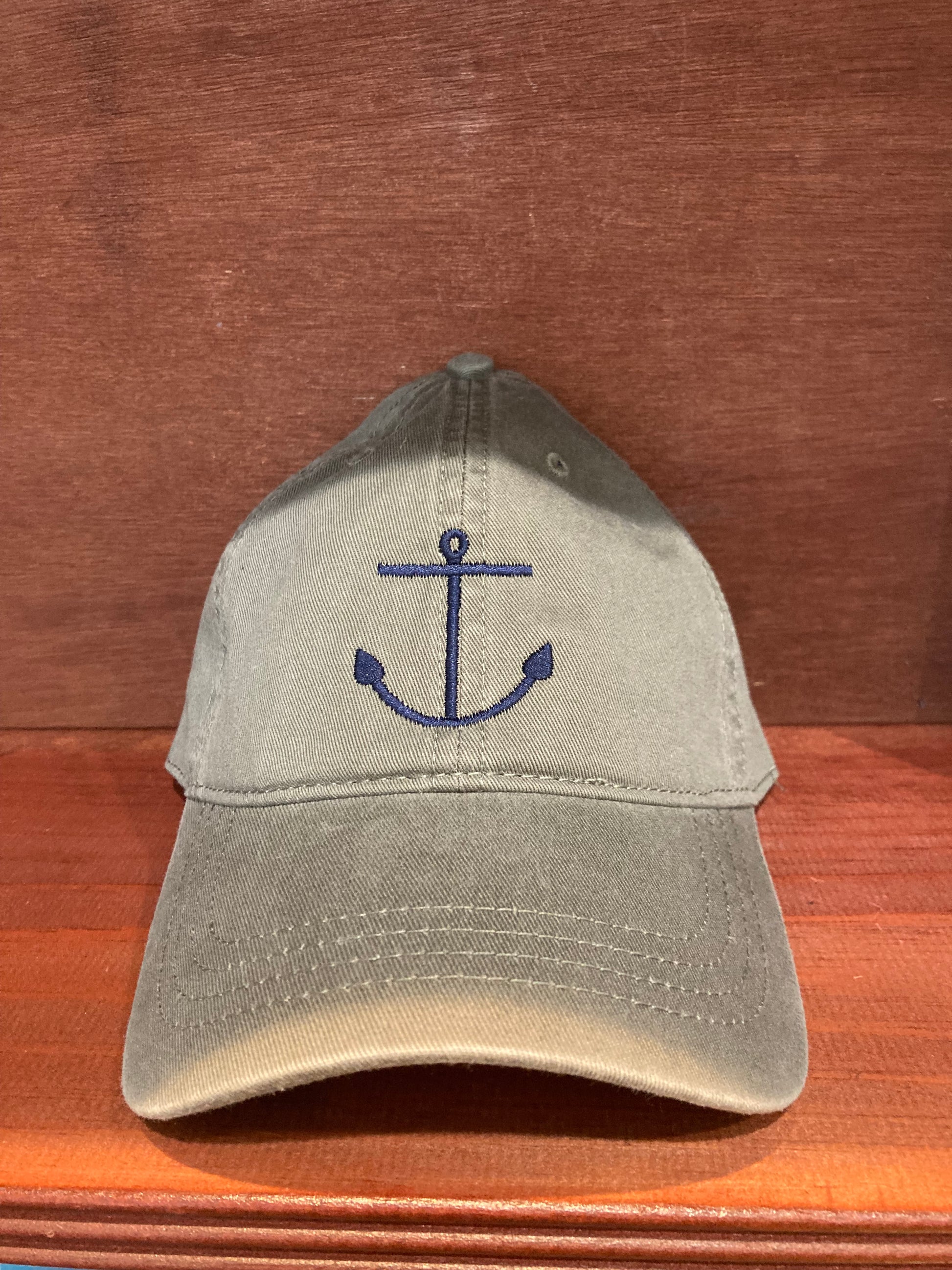 Navy island anchor embroidered on a sage twill relaxed golf cap