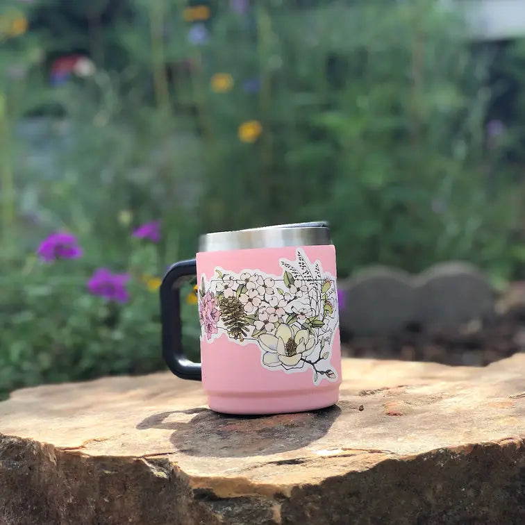 This beautifully detailed sticker depicts a watercolor painting of native plants from North Carolina's mountains to the sea. Rhododendron, longleaf pine, dogwood, magnolia, sea oats, and Venus flytrap are framed by an outline of the state.