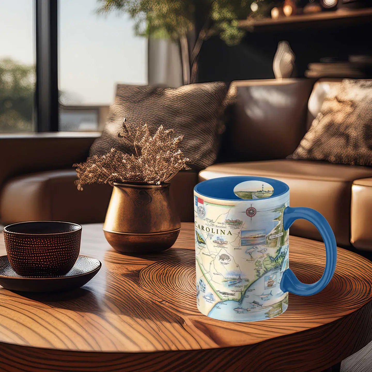 The North Carolina State Map Mug by Xplorer Maps features original hand-drawn artwork by Chris Robitaille, showcasing the Blue Ridge Mountains, Outer Banks, and historic cities of the Tar Heel State. This 16 oz ceramic mug has a full-wrap vintage-style map, making it a perfect gift for travelers and state enthusiasts.