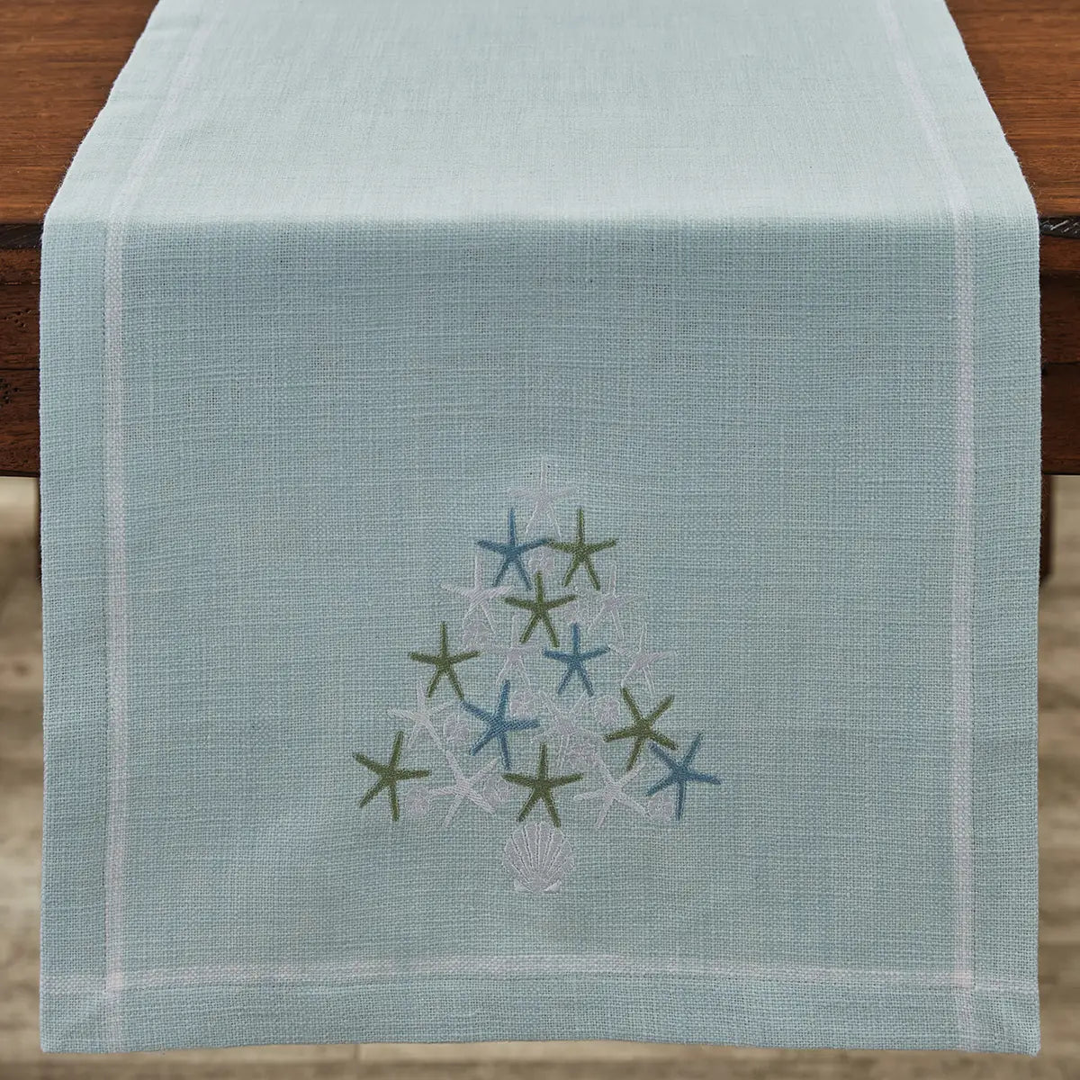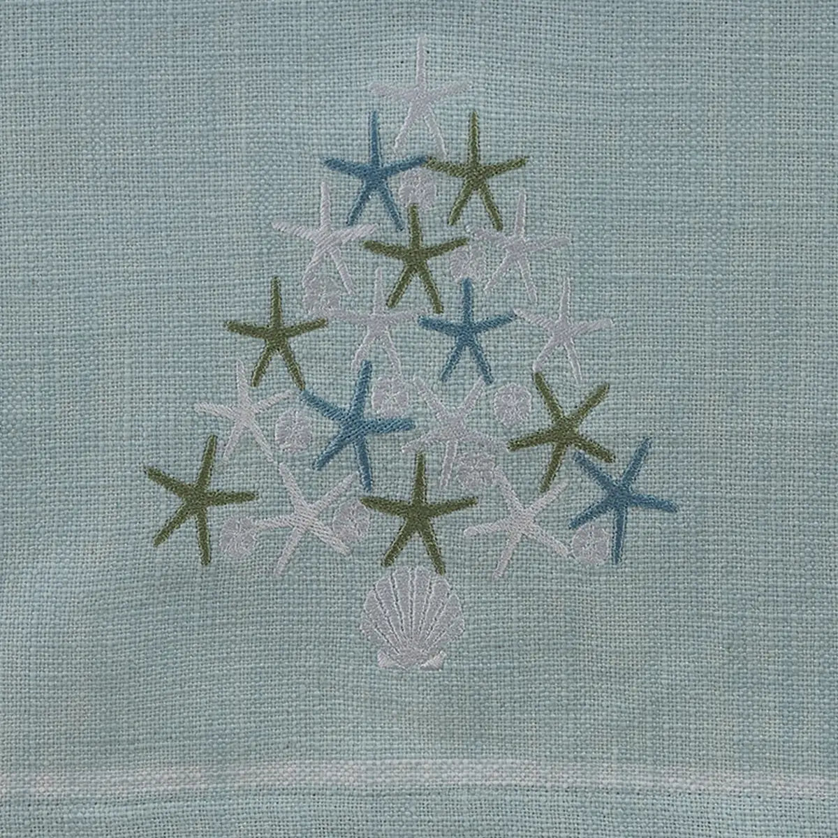 Bring coastal charm to your holiday décor with the Seas And Greetings Table Runner. Crafted from light blue slub cotton, this runner features a delicate white line border for a crisp, clean look. Embroidered starfish and sand dollars in shades of green, blue, and white form a whimsical Christmas tree, with a white seashell serving as the tree's base. Measuring 15" x 72", it’s the perfect addition to your table, blending festive spirit with seaside elegance for a truly unique holiday display.