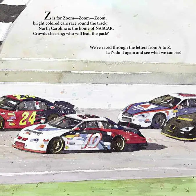 From the Appalachian Mountains to the Outer Banks, readers will be delighted to discover the beautiful state of North Carolina in "T is for Tarheel". Explore the Biltmore mansion, with its 255 rooms, which took nineteenth century millionaire George Washington Vanderbilt six years to have built. Learn about the history and lore of NASCAR racing under "Z is for Zoom!"