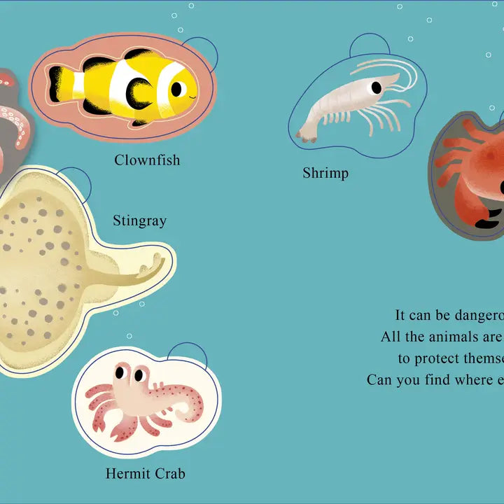 The most-playful animals on the sea floor are looking for places to hide and stay out of danger. Do you know which animal takes shelter among the tentacles of sea anemones? Can you find the seahorse’s ideal home? Develops small motor skills and fosters hand-eye coordination in young readers, with the eight removable pieces and lift-the-flaps. Learning is enhanced through observation and reasoning as you discover each animal’s hideout.